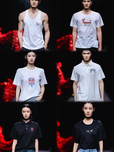 一是非遗技艺与现代设计交相辉映。本次时尚之夜以“时尚湾区•非遗新造”为主题,汇聚了粤港澳三地22个非遗服装品牌。其中,利工民的展演作品尤为亮眼——品牌巧妙融合国家级非遗“粤绣(广绣)”的细腻针法与区级非遗“利工民汗衫背心制作技艺”的经典工艺,打造出系列“非遗潮T”。走秀环节中,模特身着的这些汗衫背心看似简约,实则暗藏巧思:胸前精致的青铜纹样与醒狮图案,是广绣技艺与百年汗衫工艺的完美对话;特别是“饕餮纹”的黑色背心,古老纹样经现代设计焕变为潮酷图腾,生动诠释了传统技艺在当代服饰中的创新表达。