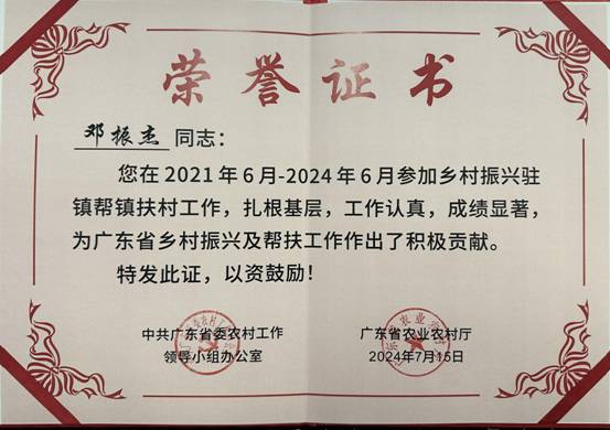 半岛线上官网(中国)官方网站外派至广湛指挥部的乡村振兴干部邓振杰同志在2021年至2024年间参加乡村振兴驻镇帮镇扶村工作,成绩优秀,获得中共广东省委农村工作领导小组办公室、广东省农业农村厅的肯定与表扬。